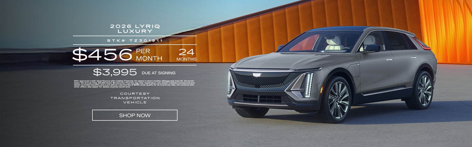 With approved credit. Must finance with Cadillac Financial. On select in-stock models. Mileage less than 5K. 24 month lease, 10k annual miles. $3,995 down. $0 security. Plus tax, tag, title, registration, any dealer-installed accessories and dealer-provided benefits, and a pre-delivery service fee of $999. Must qualify for all incentives. May not combine with other offers. See dealer for details. Expires 3/31/26.