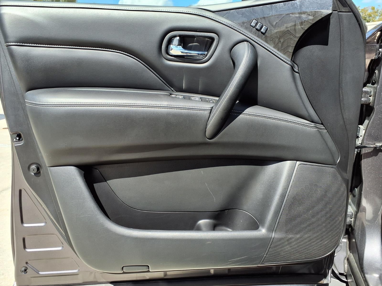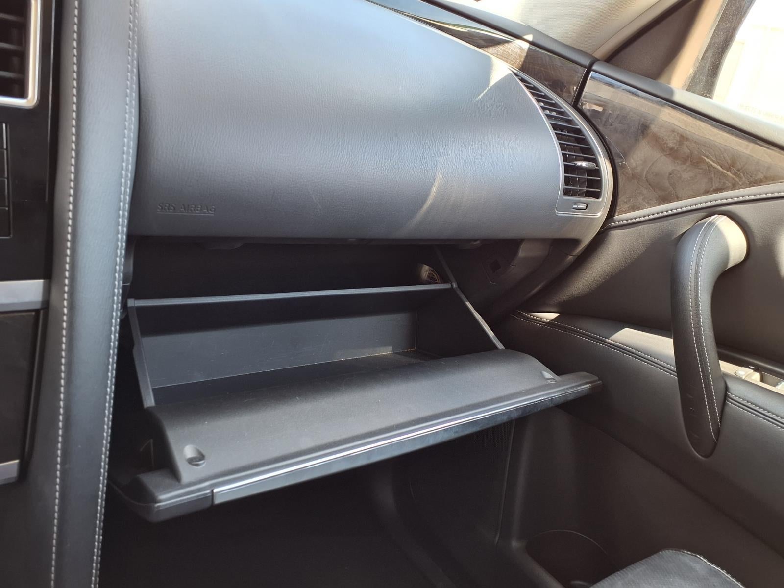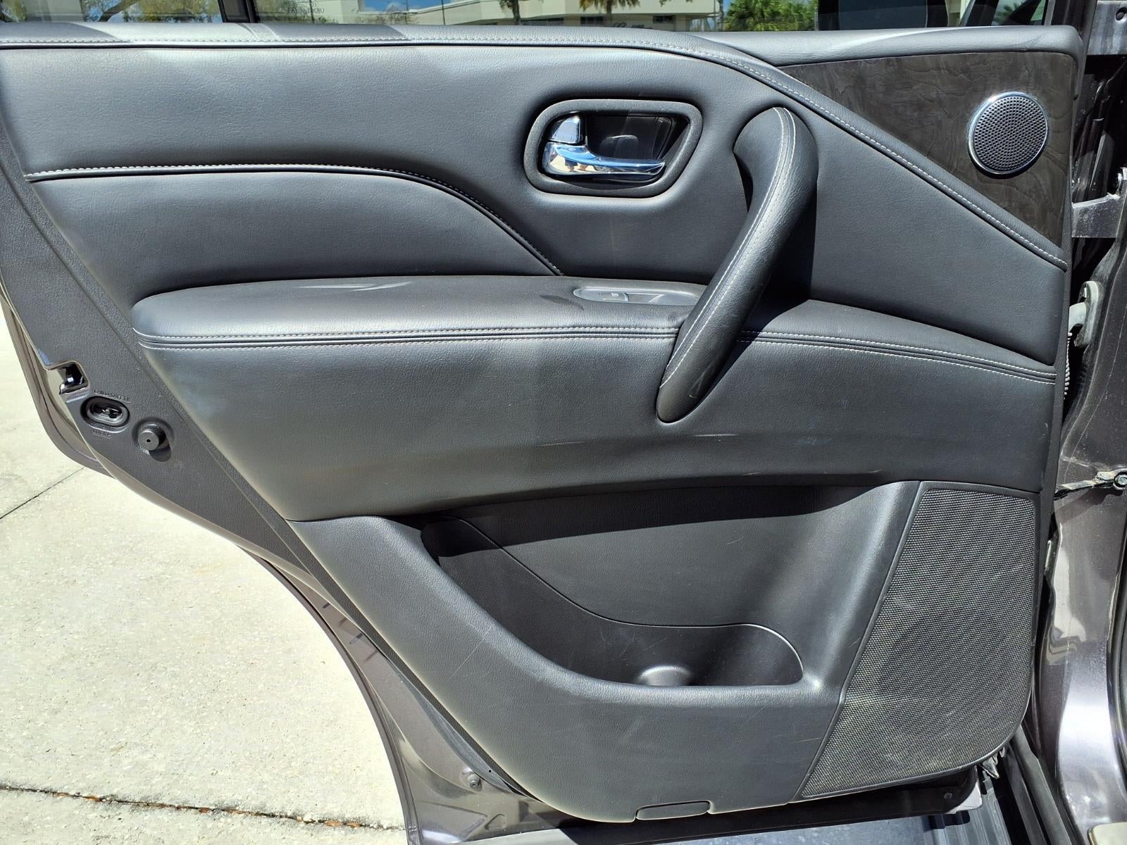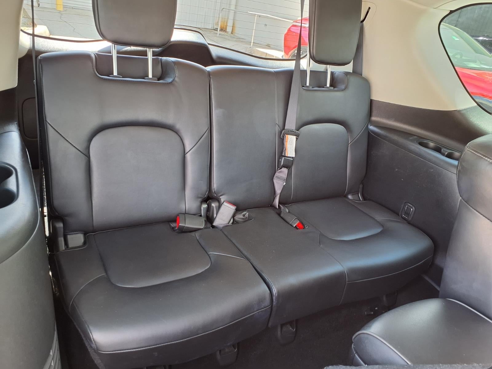 Equipped with Cargo Package (Cargo Net, Carpeted Cargo Mat, Center Console Tray, Console Net, and First-Aid Kit), 13 Speakers, 2.937 Axle Ratio, 3rd row seats: split-bench, 4-Wheel Disc Brakes, ABS brakes, Air Conditioning, Alloy wheels, AM/FM radio: SiriusXM, Anti-whiplash front head restraints, Auto High-beam Headlights, Auto tilt-away steering wheel, Auto-dimming door mirrors, Auto-dimming Rear-View mirror, Auto-leveling suspension, Automatic temperature control, Brake assist, Bumpers: body-color, Compass, Delay-off headlights, Driver door bin, Driver vanity mirror, Dual front impact airbags, Dual front side impact airbags, Electronic Stability Control, Emergency communication system: INFINITI InTouch, Four wheel independent suspension, Front anti-roll bar, Front Bucket Seats, Front Center Armrest, Front dual zone A/C, Front fog lights, Front reading lights, Fully automatic headlights, Garage door transmitter: HomeLink, Heated door mirrors, Heated Front Bucket Seats, Heated front seats, Heated steering wheel, Illuminated entry, INFINITI Radiant Illuminated Kick Plates (N93), Leather Shift Knob, Leather steering wheel, Leather-Appointed Seats, Literature Kit, Low tire pressure warning, Memory seat, Midyear Change, Navigation system: